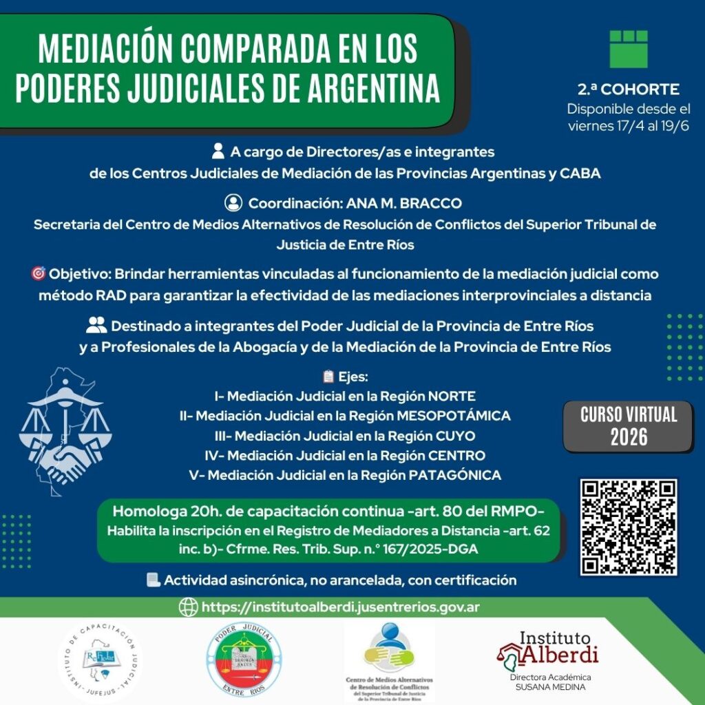 🌐 Más información: https://institutoalberdi.jusentrerios.gov.ar/events/curso-virtual-mediacion-comparada-en-los-poderes-judiciales-de-argentina/