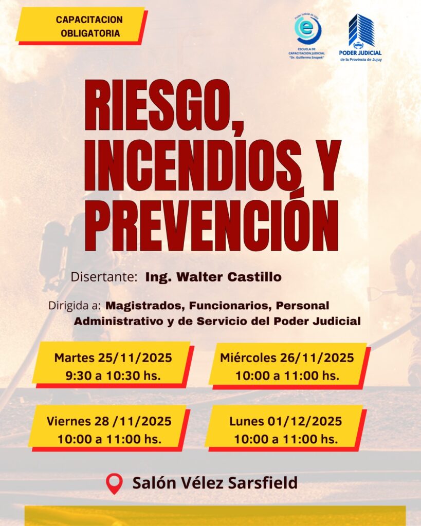 La Escuela de Capacitación Judicial “Dr. Guillermo Snopek” coorganiza en conjunto con el Departamento Técnico e Intendencia del Poder Judicial, la Capacitación Esencial sobre Riesgo de Incendio y Prevención en el marco de la Capacitación H.S.T. (Higiene y Seguridad en el Trabajo). La misma será dictada por el Ing. Civil, Especialista en Higiene y Seguridad en el Trabajo, Walter Castillo y se llevará a cabo en el Salón Vélez Sarsfield en las siguientes fechas: