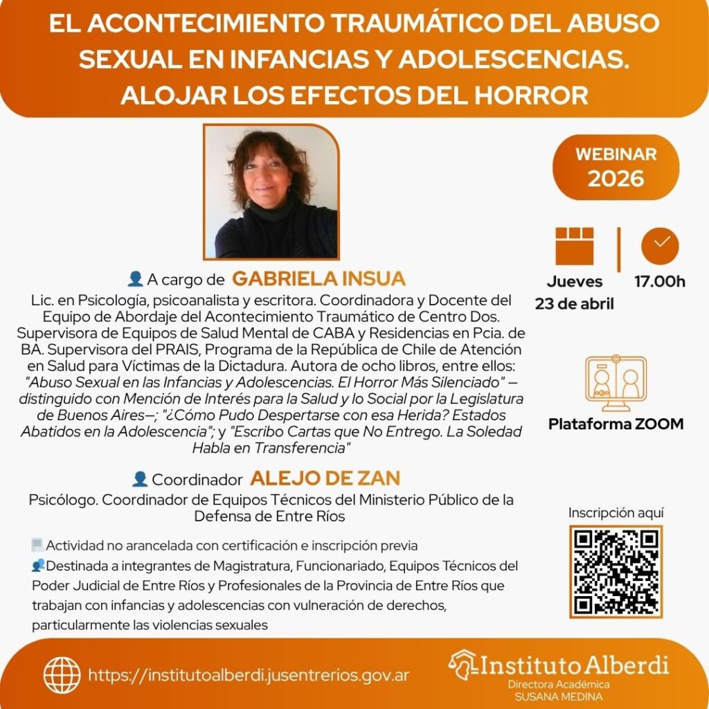 👥 Destinado a integrantes de Magistratura, Funcionariado, Equipos Técnicos del Poder Judicial de Entre Ríos y Profesionales de la Provincia de Entre Ríos que trabajan con infancias y adolescencias con vulneración de derechos, particularmente las violencias sexuales