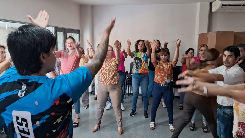 Y el Prof. de Educación física Sebastián Rojas estuvo a cargo de la realización de la “Pausa activa”, cuya finalidad es incentivar a los empleados a la realización de actividad física, a fin de poder mejorar su calidad de vida, energía, salud y bienestar corporal.