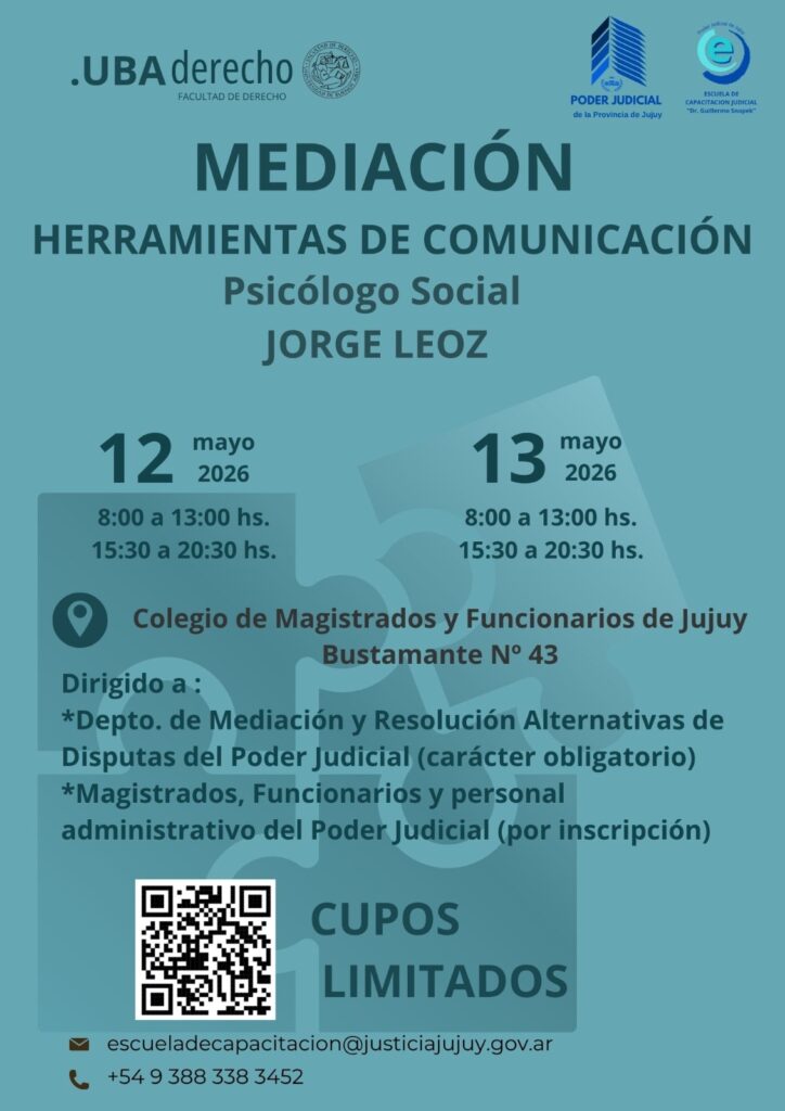 La capacitación estará a cargo del Psicólogo Social Jorge Leoz y se realizará bajo modalidad presencial los días 12 y 13 de mayo, en el Colegio de Magistrados y Funcionarios de Jujuy, ubicado en Bustamante N° 43. El horario será de 8:00 a 13:00 hs. y de 15:30 a 20:30 hs. en ambas jornadas.
