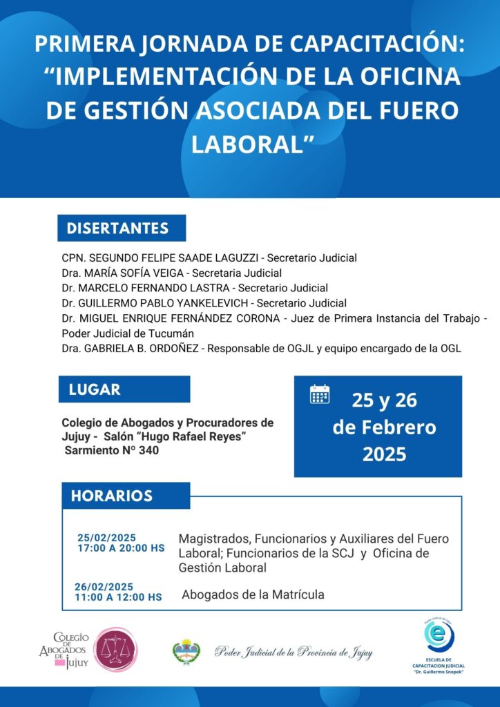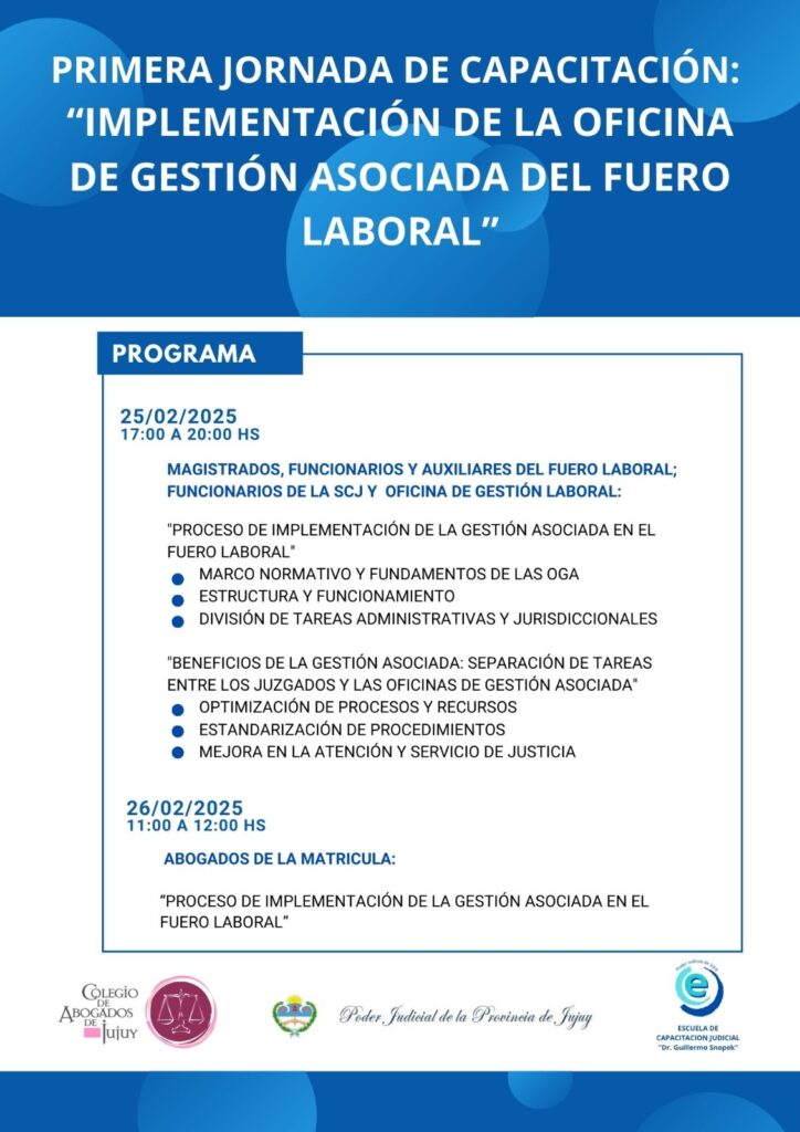 Organizada por la Escuela de Capacitación Judicial “Dr. Guillermo Snopek”, se llevará a cabo la Primera Jornada de Capacitación sobre Oficinas de Gestión Asociada (OGA) del Fuero Laboral, en el marco de la implementación de la misma en el Poder Judicial de Jujuy.