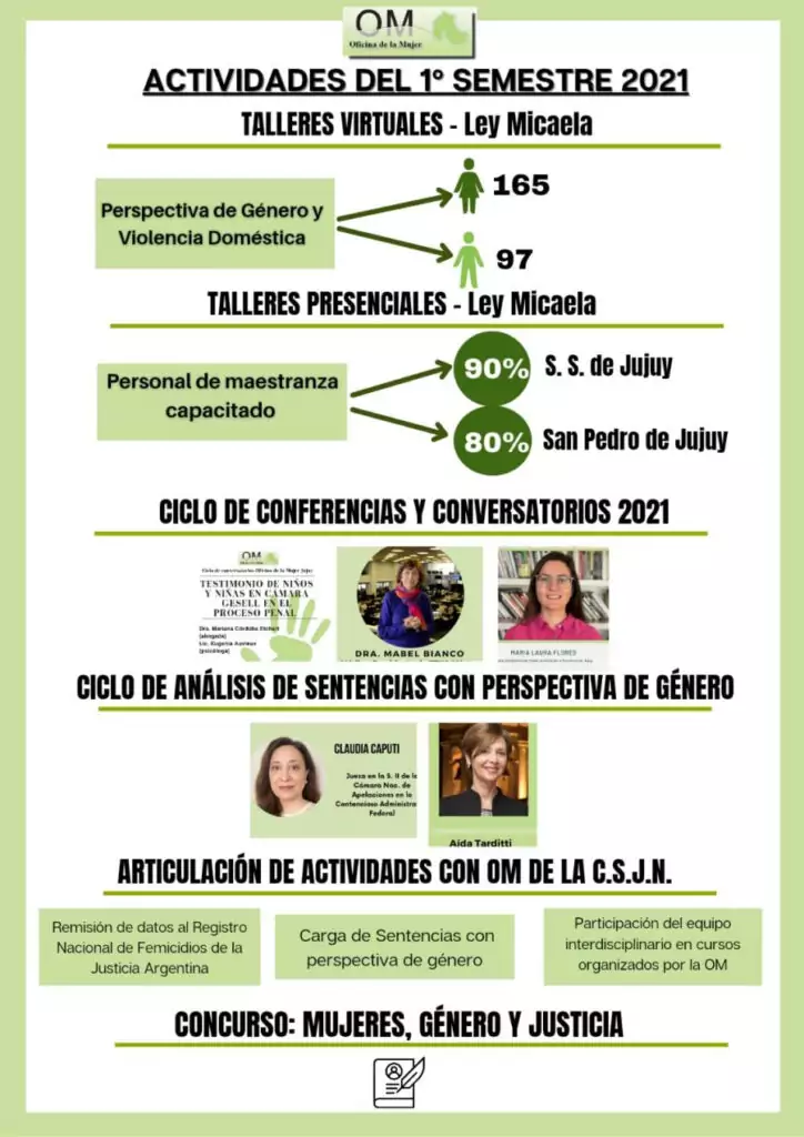 La magistrada precisó que en la primera parte del presente año, las actividades se desarrollaron mediante talleres, ciclo de conversatorios y conferencias, ciclo de análisis de sentencias con perspectiva de género, actividades de extensión, y articulación de trabajos con la Oficina de la Mujer de la CSJN.